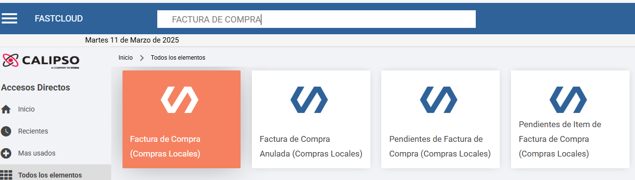 Se accede desde la carpeta Compras > Compras Locales, que contiene las siguientes subcarpetas: