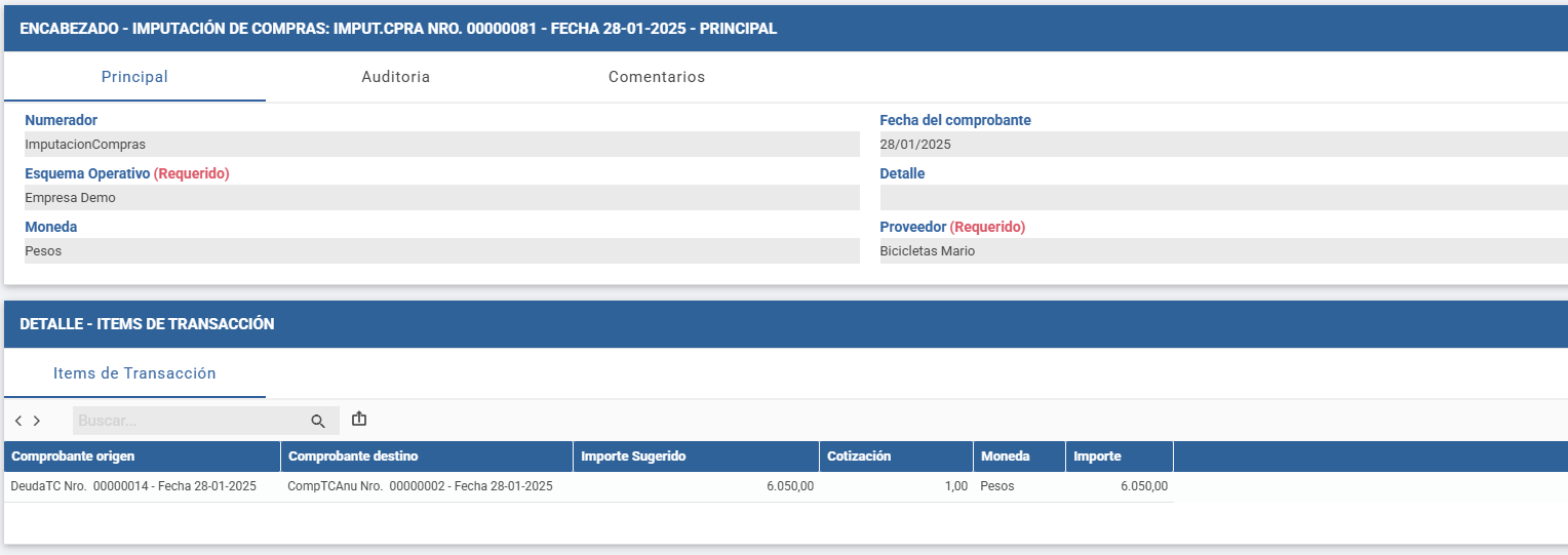 - Fecha de Comprobante: fecha de la imputación. Por defecto, carga la fecha del día.
