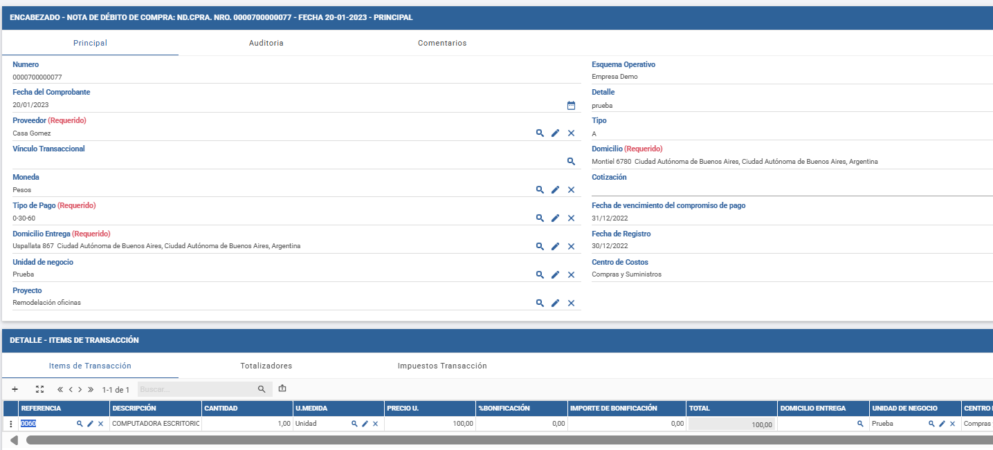 La Nota de Débito de Compra sirve para registrar el comprobante oficial por un ajuste de saldo a favor del proveedor. Esta transacción se genera desde nuevo, afecta la cuenta corriente y genera un asiento contable.