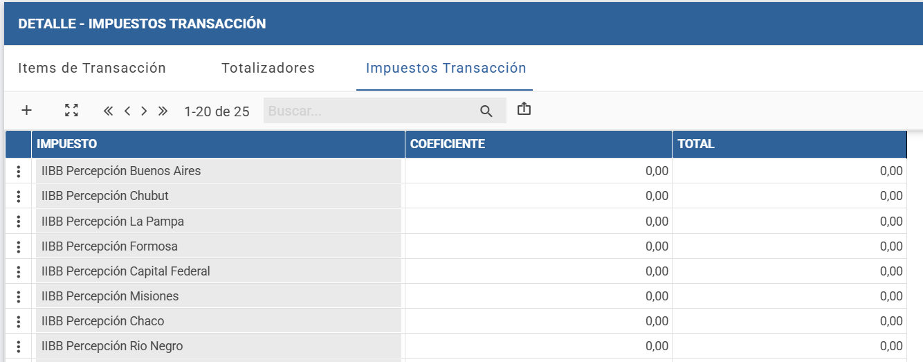 - En la solapa Impuestos de Transacción, se mostrará un listado donde podrá modificar los valores de las percepciones presentes en la Nota de Débito.