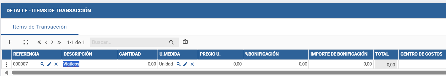 5. En la sección Detalle, completar los campos correspondientes a los ítems que hayan sido registrados en el ticket a rendir. Utilizar el botón "+", para sumar una fila por cada referencia a incorporar. Dado que no es un comprobante fiscal, en esta sección no hay información impositiva.