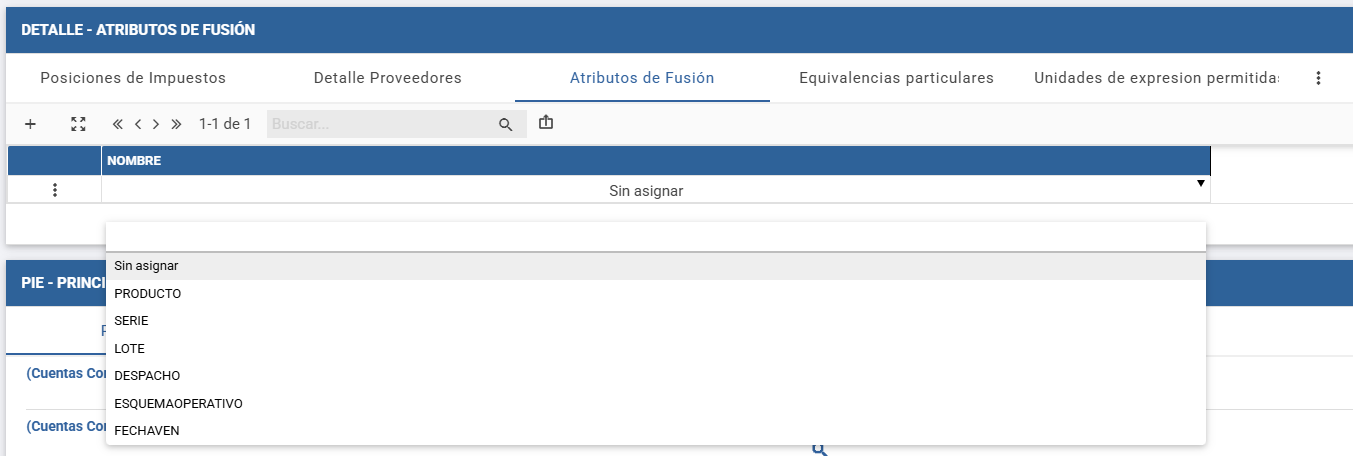 b) en la solapa Atributos de Fusión, podrá asignar los atributos según los cuales se organizará el stock del producto. Tener en cuenta:
