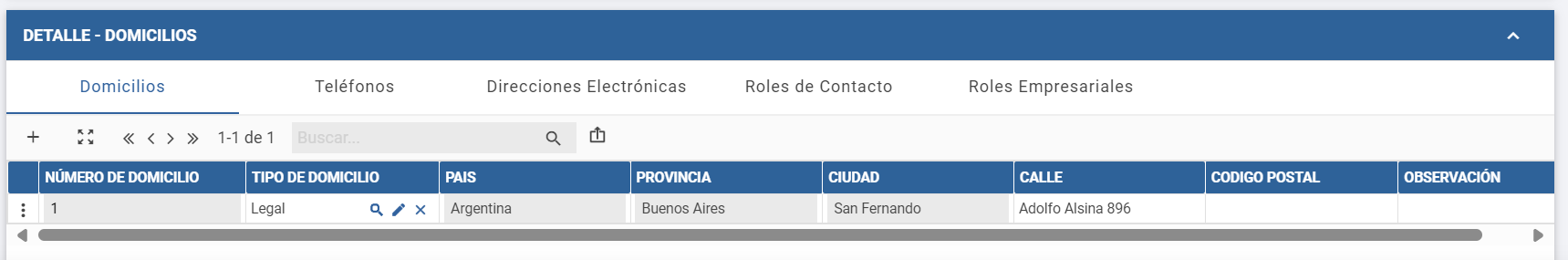 5. En la sección Detalle, podrá ampliar la información correspondiente a Domicilios, teléfonos, direcciones electrónicas y Roles. Utilizar el botón "+", para sumar una fila por cada dato que requiera incorporar.