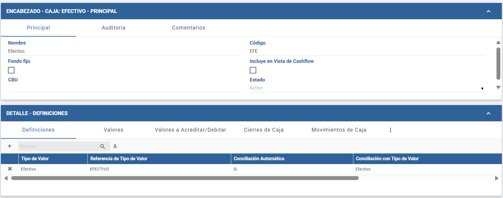 Código: código de la Caja. Ejemplo: "EFE" si corresponde a valores en efectivo.