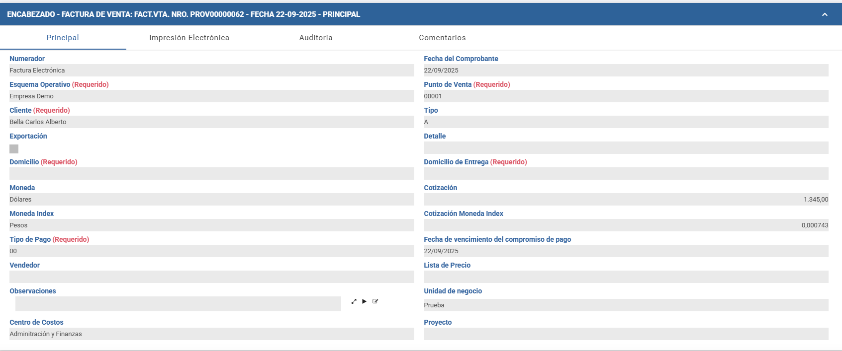 Esta transacción permite emitir el comprobante oficial de la venta. Tras su autorización en el ERP, se envía automáticamente a ARCA, para su validación y numeración definitiva.