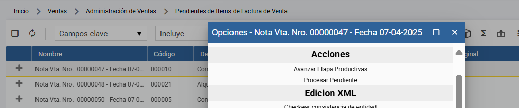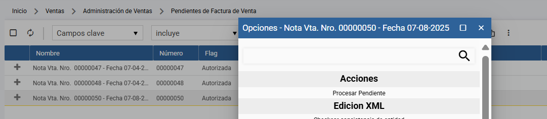 - Ubicación: carpeta Ventas > Administración de Ventas > Pendientes de Factura de Venta.