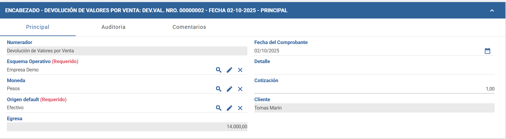 Esta transacción permite registrar la restitución de valores al cliente, luego de que este realizara una devolución de mercadería asentada en el sistema. Esto garantiza la trazabilidad entre la venta original, la devolución de mercadería y la restitución de valores, generando un asiento contable.
