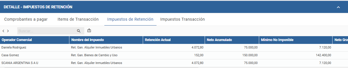 Cuando se realiza el pago desde el Egreso de Valor, en la solapa Impuestos de Retención de la sección Detalle, se incorporó el campo Operador Comercial: el mismo detalla el grupo de integrantes informados a los cuales el sistema le realizará -de forma automática- la retención, según los porcentajes de titularidad indicados: