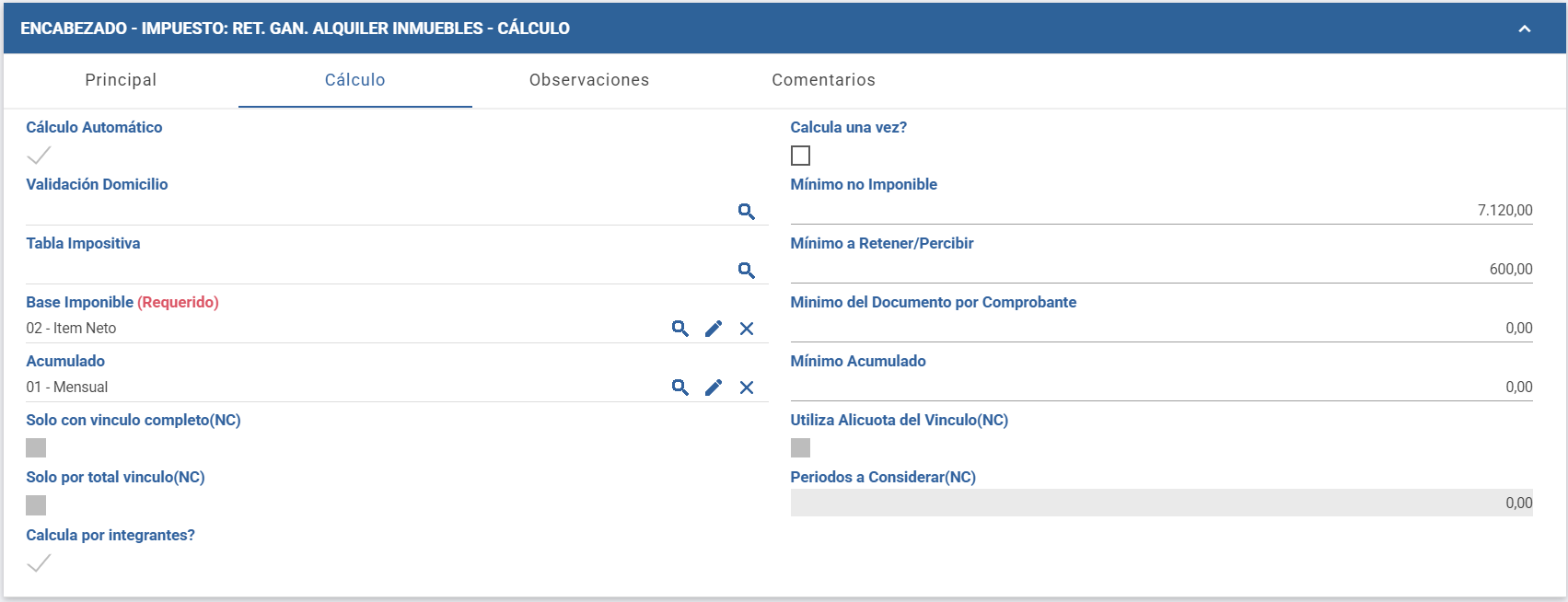 - Configurar el Impuesto, indicando que el cálculo se realizará por integrantes.