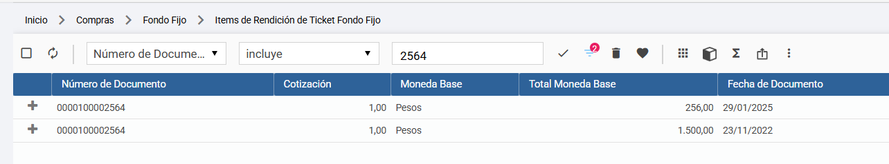 Se accede siguiendo la ruta: Compras > Fondo Fijo > Ítems de Rendición de Ticket Fondo Fijo.