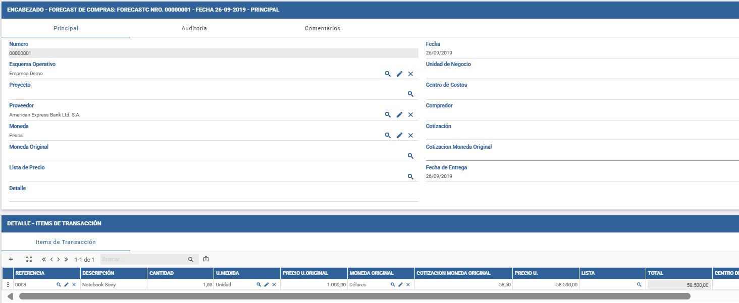 - Proveedor: proveedor que emite el forecast, al cual se realizaría la compra. Al indicar el proveedor, se autocompletarán los campos asociados.