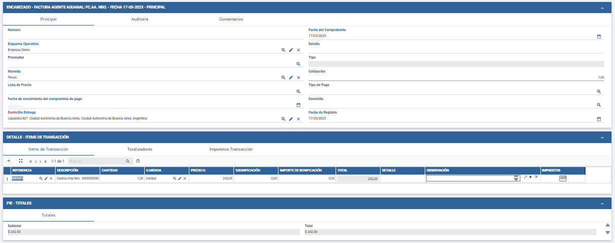 Esta transacción permite cargar la factura emitida por el Despachante de Aduana del producto importado, la cual puede incluir tanto los honorarios como los gastos de importación que hayan sido abonados por este.
