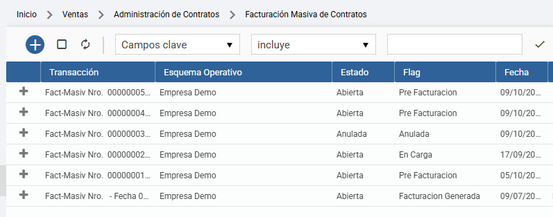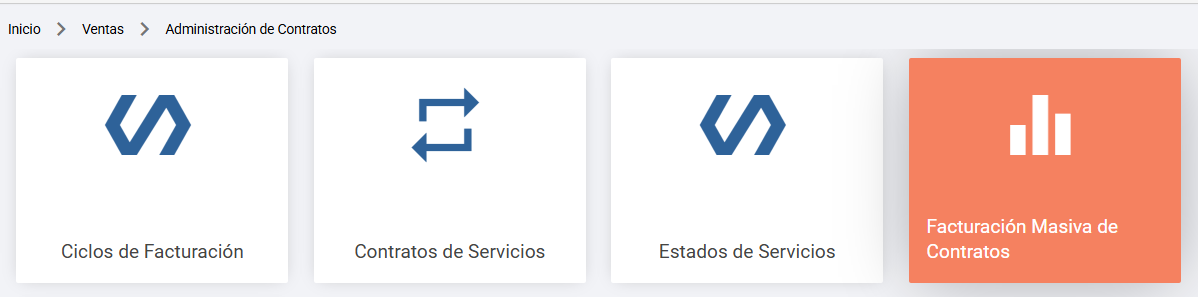 Se accede desde la carpeta Ventas > Administración de Contratos > Facturación Masiva de Contratos.