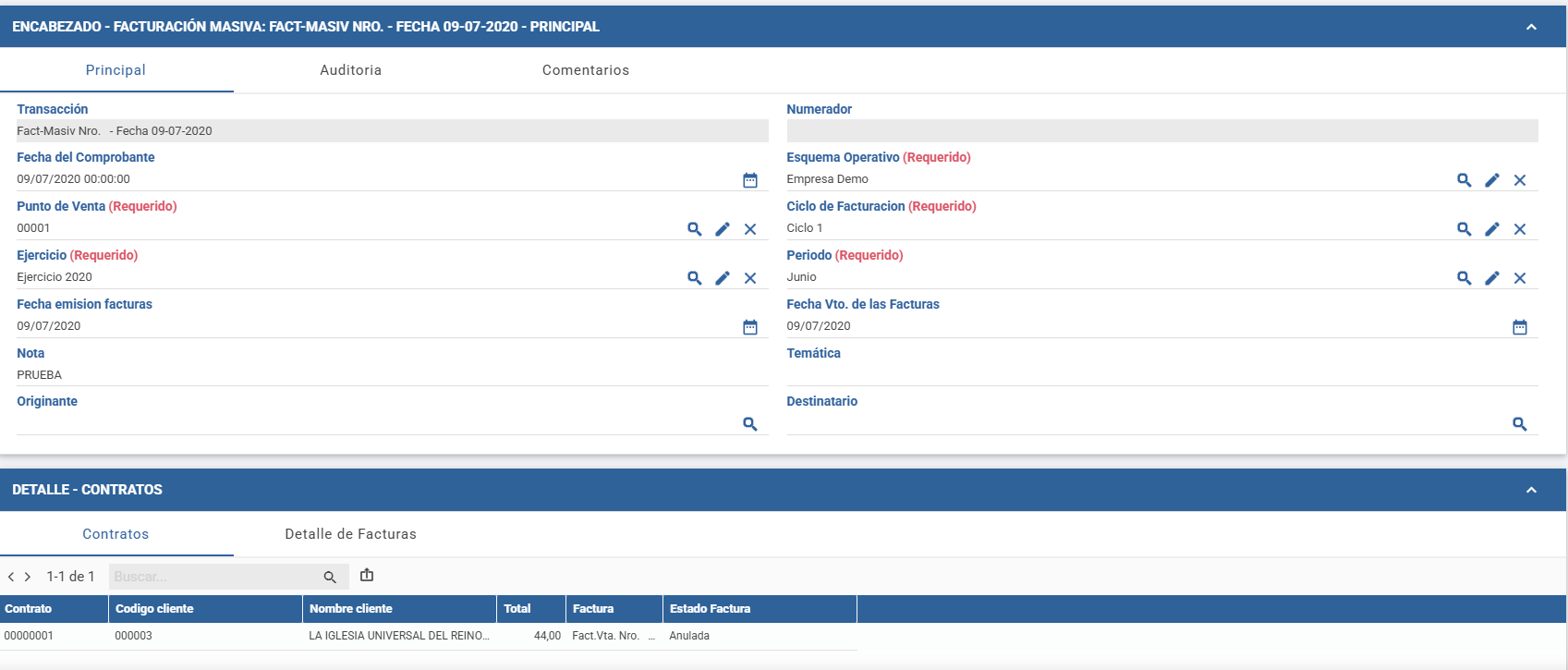 - El Ciclo de Facturación: cargado previamente. El mismo define el conjunto de contratos que serán incluidos en el proceso, según la frecuencia establecida en cada contrato.