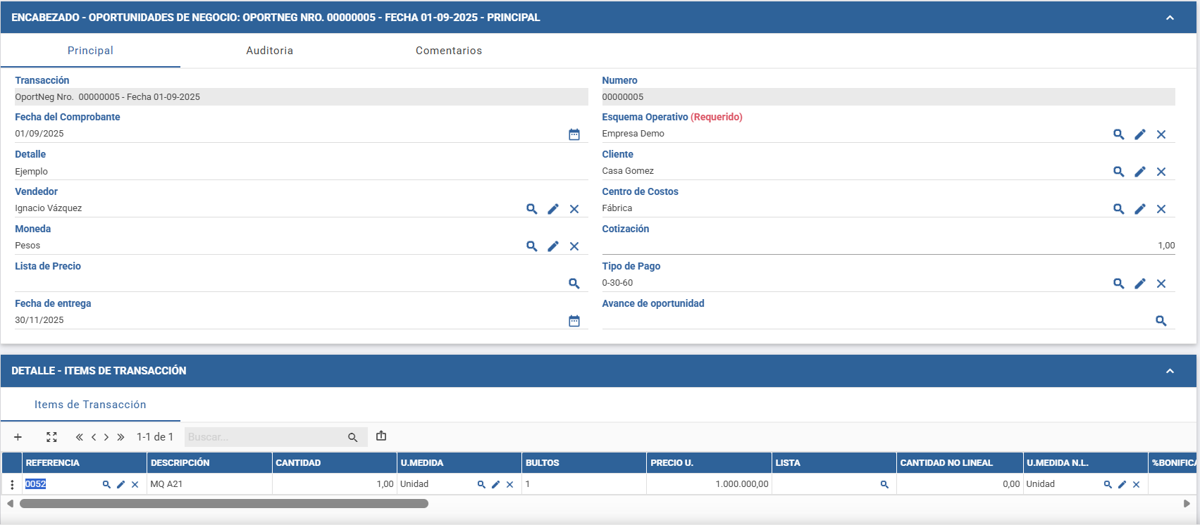 - Detalle: Campo de texto libre que será heredado por transacciones posteriores.