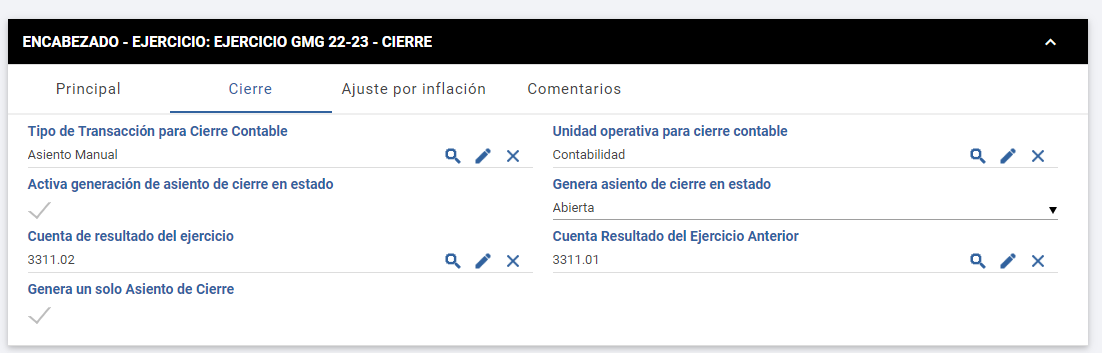 Si el ejercicio a cerrar es, por ejemplo, Ejercicio GMG 22-23, se debe configurar: