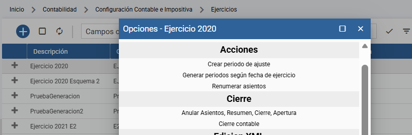 - Ejecutar la acción Cierre contable desde el menú de acciones del ejercicio.