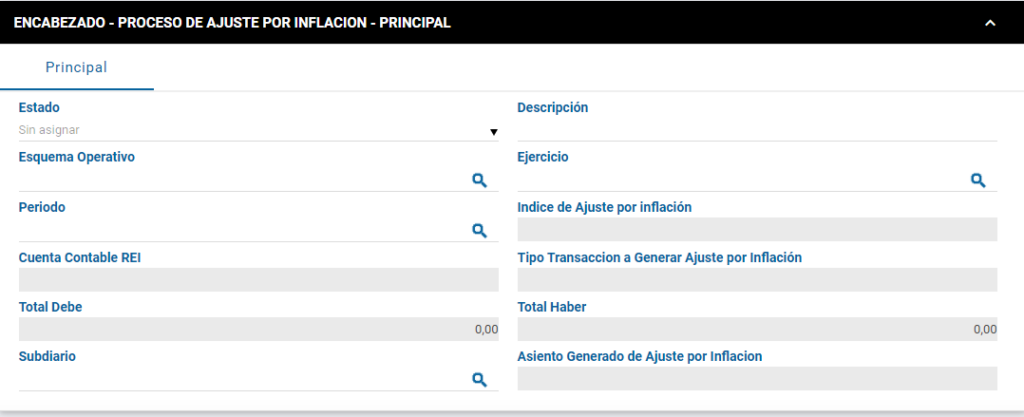 ● Tipo de transacción a generar por ajuste por inflación : Dato que se completa automáticamente en base a los datos configurados en el ejercicio contable seleccionado