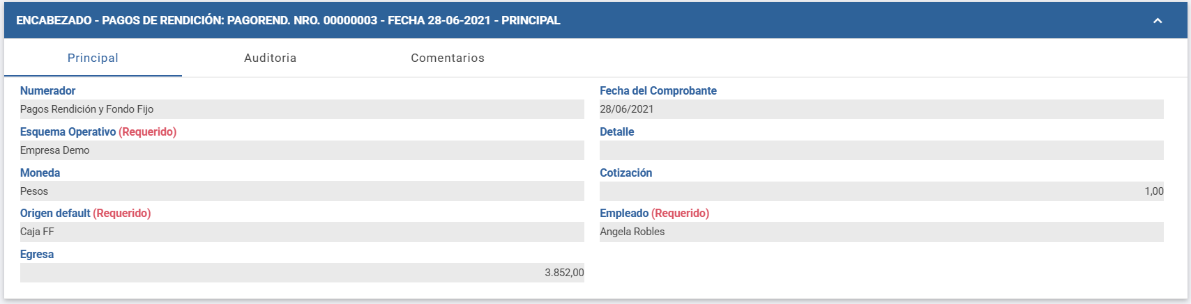 La transacción Pago de Rendición se utiliza para generar los pagos de rendiciones a Empleados, sean estos: a) devoluciones por gastos realizados; b) o adelantos para realizar gastos.