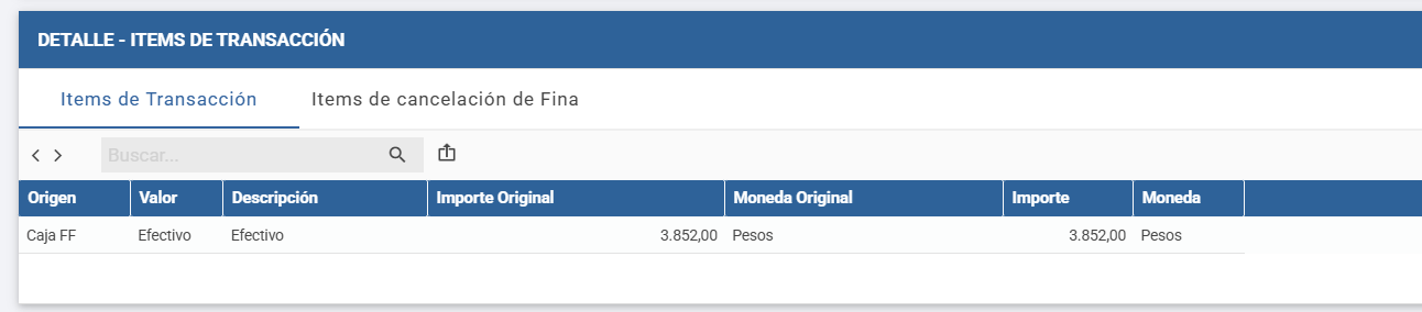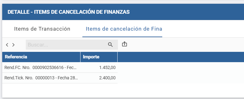 6. En el caso que cuente con información de rendiciones de ticket y facturas a imputar, podrá especificarlos en la solapa "Items de cancelación de Finanzas". En ese caso, al cerrar la operación, se hará una transacción de imputación de rendiciones automáticamente.