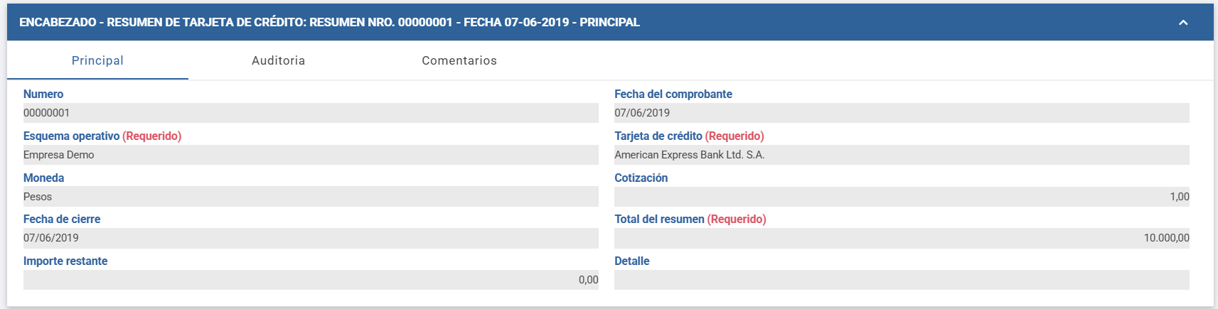 Esta transacción se utiliza para registrar cada Resumen de Tarjeta de Crédito recibido, permitiendo incluir tanto los comprobantes ya rendidos, como un ítem adicional para los comprobantes pendientes de rendir.