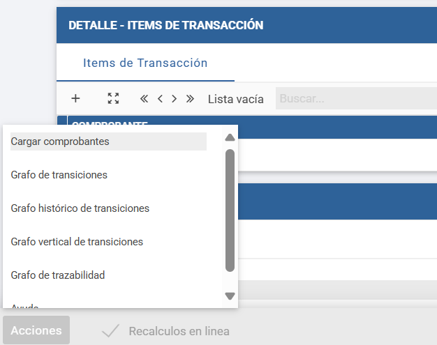 5. En la sección Detalle, la carga de ítems de esta transacción se genera de forma automática. Para eso deberá ir al botón "Acciones" y seleccionar la opción "Cargar comprobantes".
