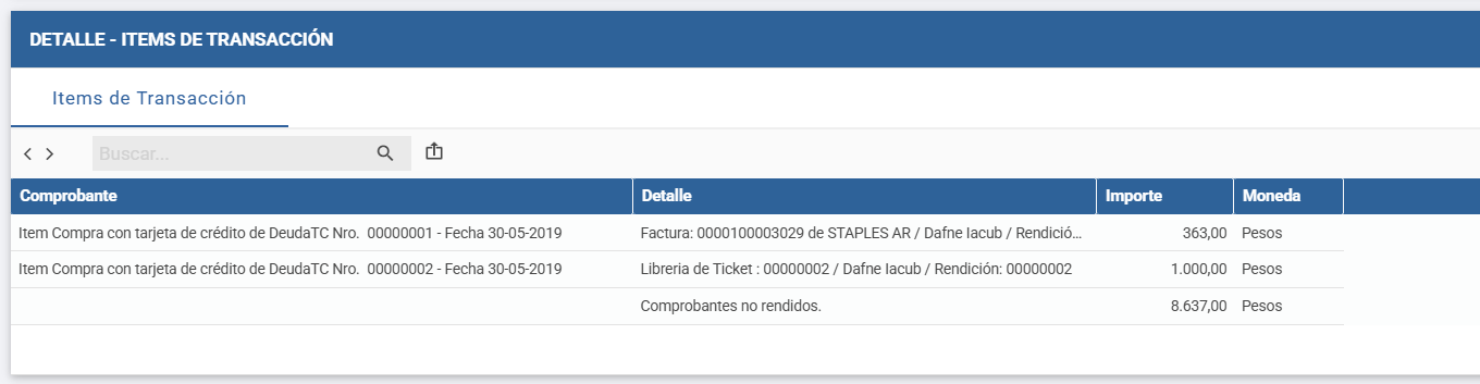 - un ítem por cada comprobante rendido para la Tarjeta de Crédito indicada, cuya fecha de cierre es anterior o igual a ingresada en la cabecera. En cada uno se detalla el Importe respectivo.