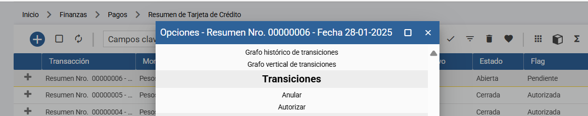 1. Para autorizar el Resumen generado en el paso anterior, deberá posicionarse sobre él, hacer click en botón derecho y, en Transiciones, seleccionar Autorizar.