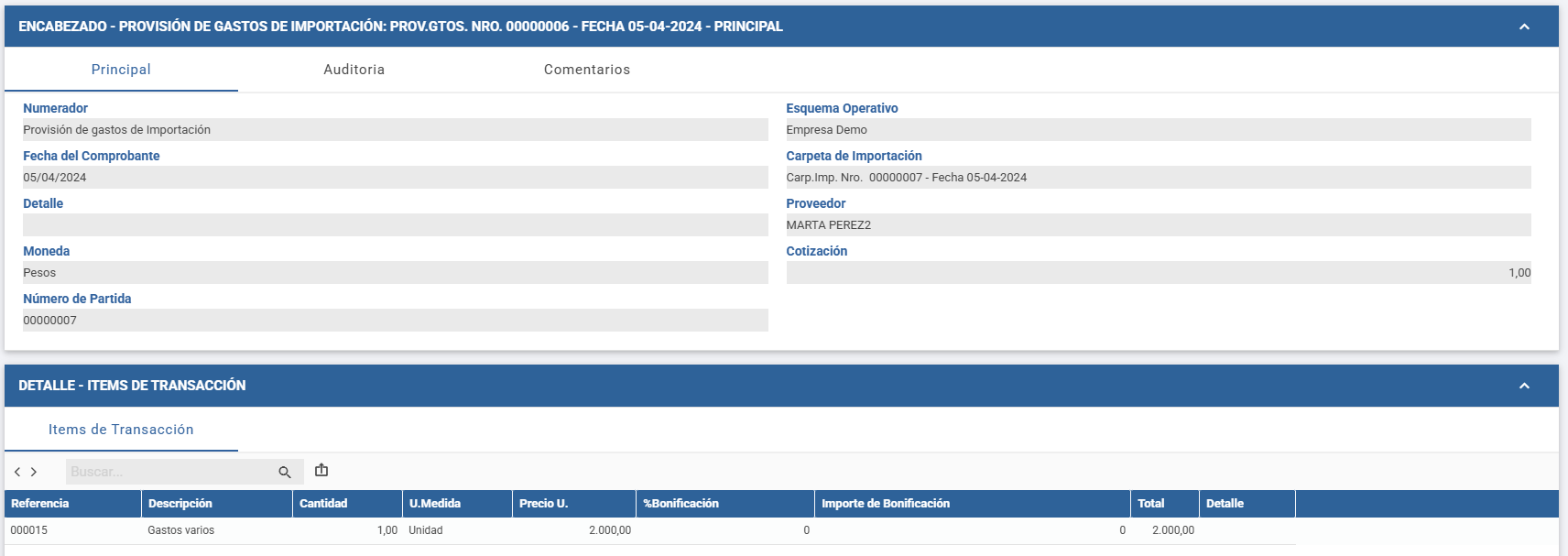 Se accede desde la carpeta Compras > Importaciones > Provisión de Gastos de Importación.