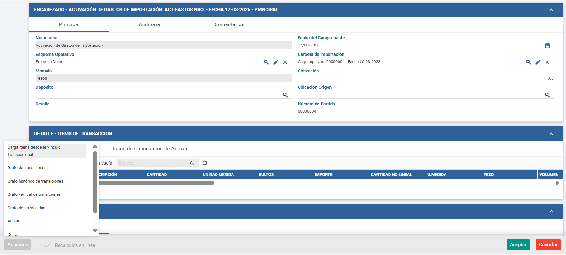 - Pulsar el botón de Acciones y seleccionar "Cargar ítems desde el vínculo transaccional" para cargar los productos importados.