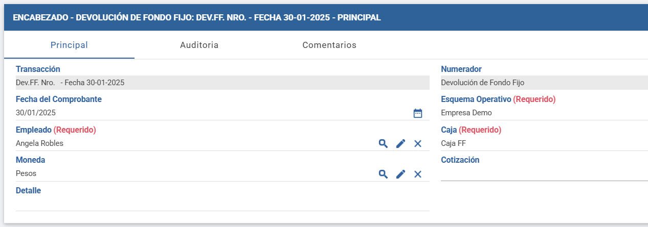 - Caja: Caja Fondo Fijo que recibirá la devolución del valor.