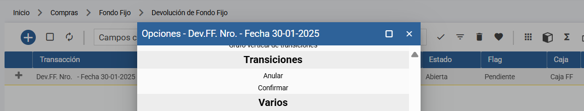 1. Para autorizar la devolución de fondo fijo, deberá posicionarse sobre la misma, hacer click en botón derecho y, en Transiciones, seleccionar Confirmar.