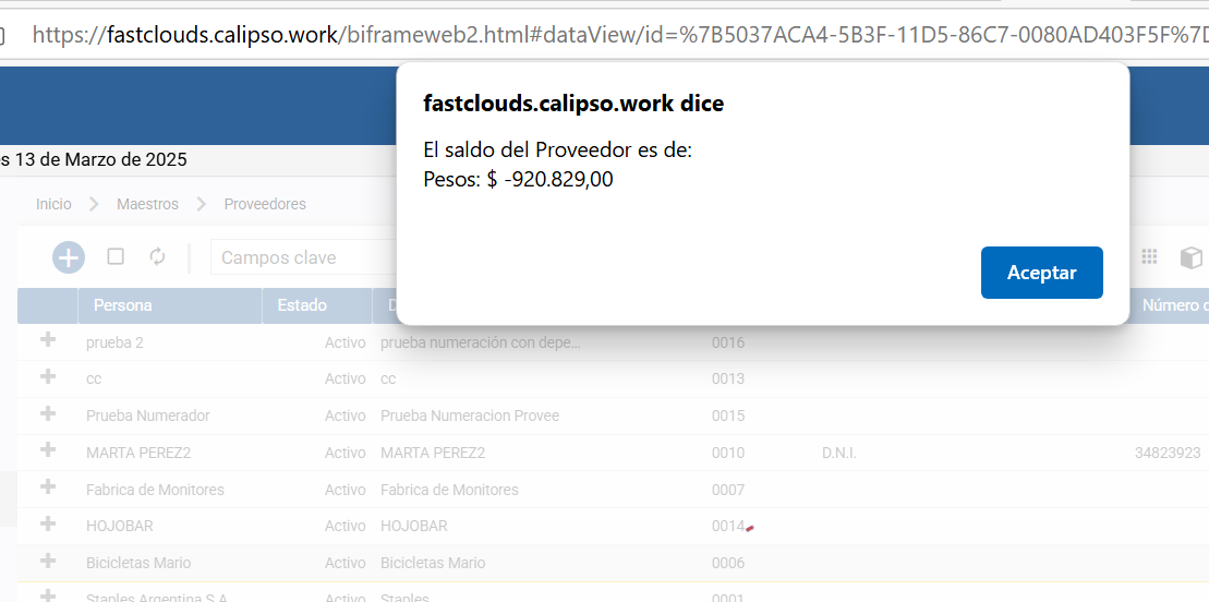 Al ejecutar la opción Saldo Proveedor / Cliente,el sistema le mostrará una notificación con el detalle del mismo.