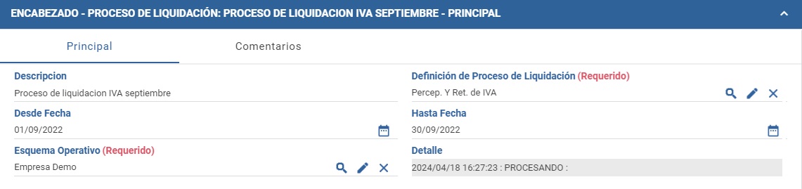 Definición de proceso de liquidación: indicar el proceso a generar. Ejemplo: IVA digital, Percepciones IIBB BA, percepciones de IVA, etc.