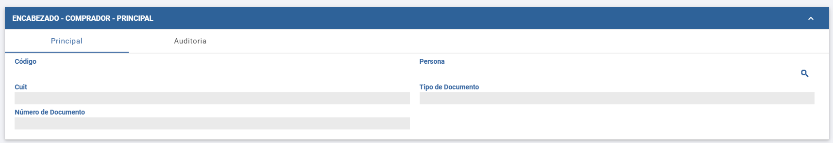 Persona: seleccionar la Persona Física asociada al comprador, dada de alta previamente. Al hacerlo, se autocompletarán los datos de CUIT, Tipo y Nro. de Documento.