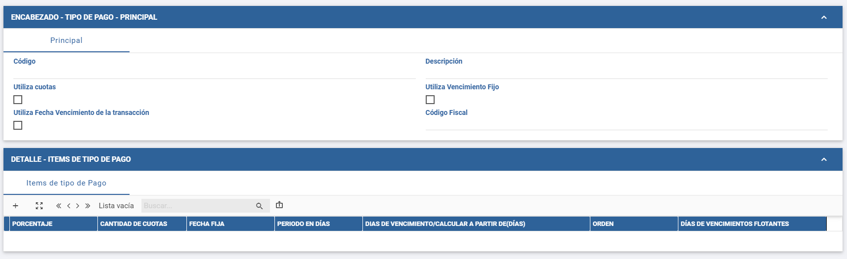 4. Completar el encabezado con los datos del Tipo de Pago, tales como Código, Descripción y Código Fiscal. También deberá tildar si utilizará cuotas, vencimiento fijo o fecha de vencimiento de la transacción.