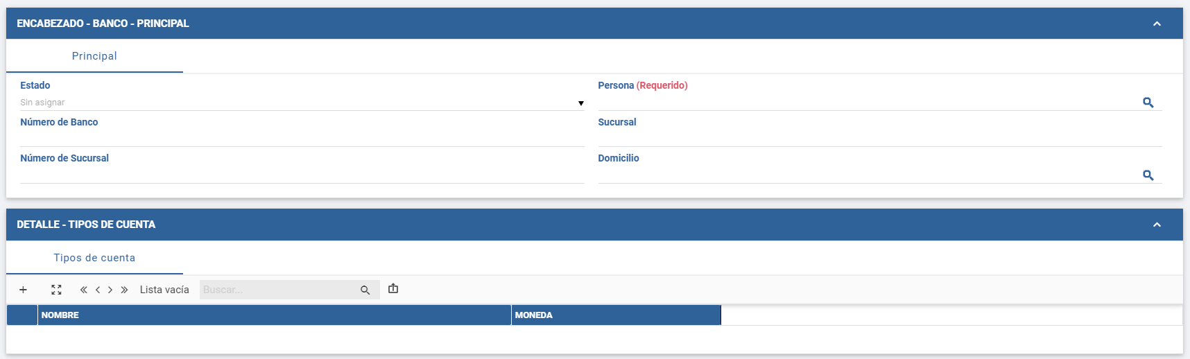 5. En la sección Detalle, indicar los Tipos de cuenta con los que se opera en relación a este Banco, como pueden ser: Cuenta corriente, Caja de ahorro, etc. Utilizar el botón "+", para sumar una fila por cada tipo de cuenta a incorporar. En cada una, indicar Nombre y Moneda.
