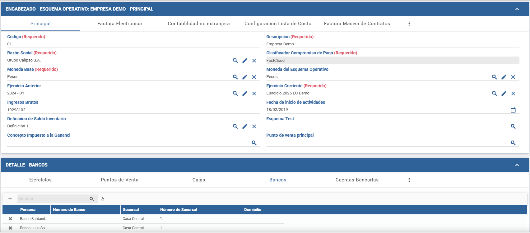 El Maestro de Bancos permite registrar las entidades bancarias con las que opera la compañía. Frecuentemente, el sistema ya incluye una carga inicial con los bancos que funcionan en el país (por ejemplo, los de Argentina).