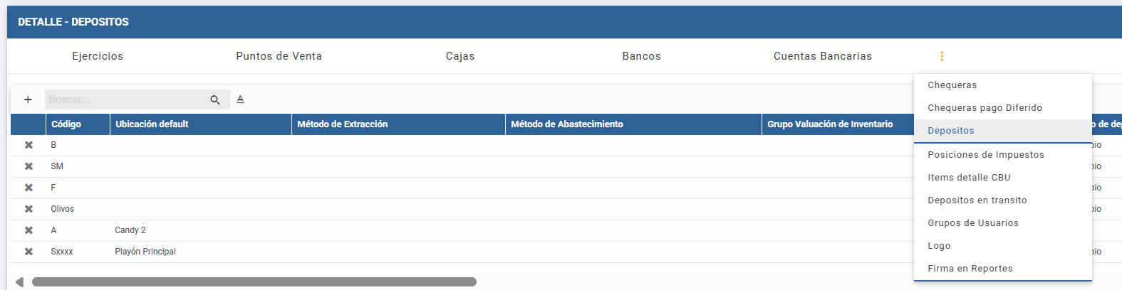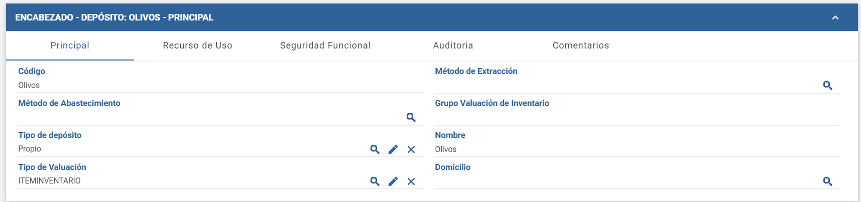 El maestro de Depósitos se utiliza para registrar los depósitos del Inventario de la organización. Estos se subdividen en Ubicaciones y, tanto el depósito como la ubicación, se utilizan en todas las transacciones de Inventario.