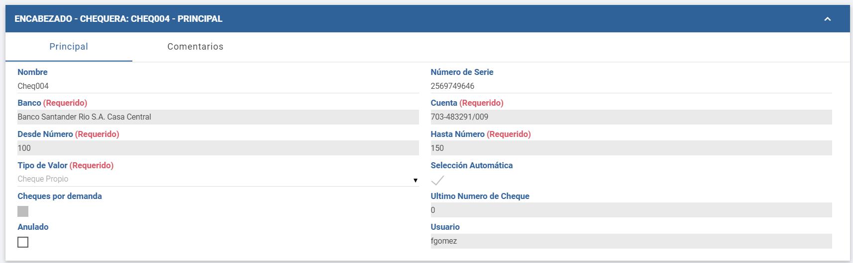 Selección automática: indica si la chequera tiene selección automática asignada. En ese caso, siempre que se utilice se asignará por defecto el próximo cheque disponible.