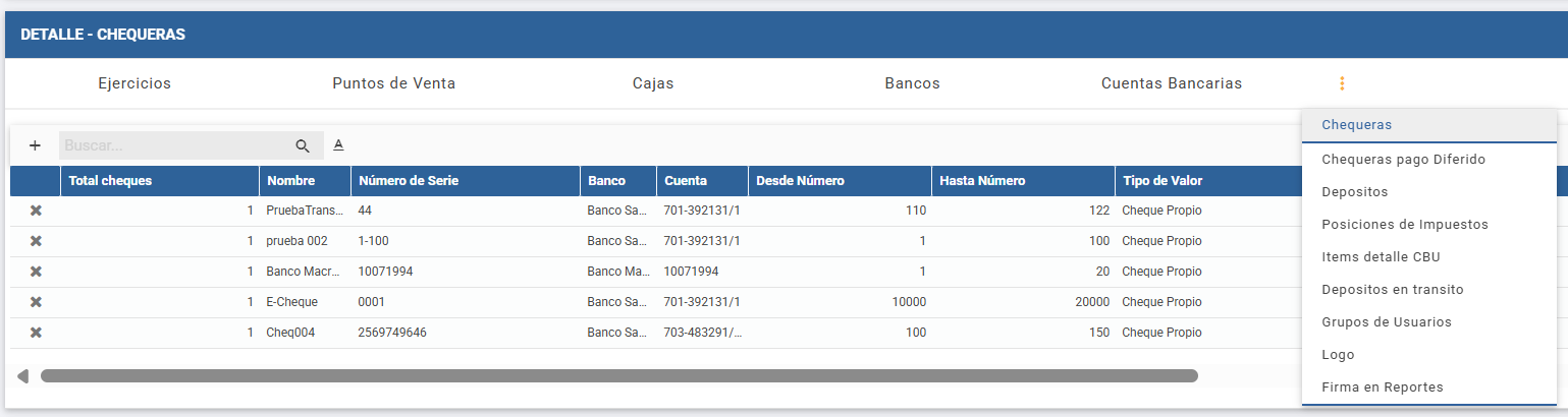 3. En la sección Detalle, ir a la Solapa Chequeras y asignar la entidad cargada anteriormente. Utilizar el botón "+", para sumar una fila por cada referencia a incorporar. En cada una, completar los datos requeridos.