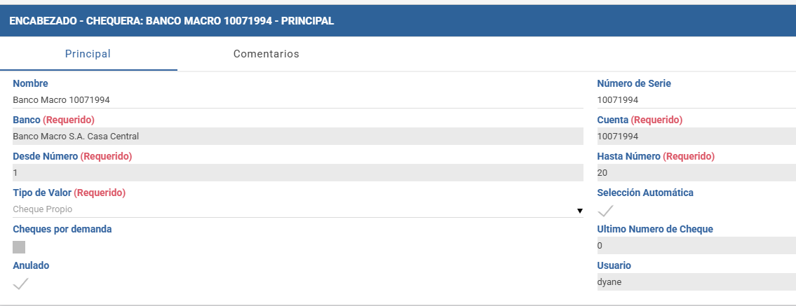 Tipo de valor: tipo de valor de la chequera (Ejemplo: cheque propio)