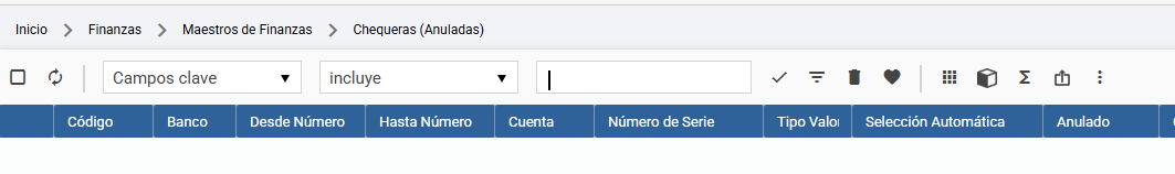 Las Chequeras que han sido anuladas, se mostrarán en la carpeta Chequeras (Anuladas), a la que se accede desde el maestro de Finanzas. Desde la Vista de la misma, podrá consultar el registro de Chequeras anuladas hasta la fecha.