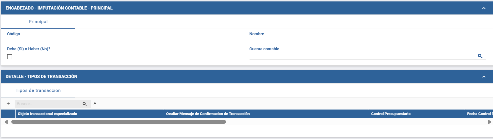 3. Completar el formulario, indicando el código y nombre que identificará a la Imputación Contable, así como la Cuenta Contable que deberá afectar las operaciones con dicha imputación.
