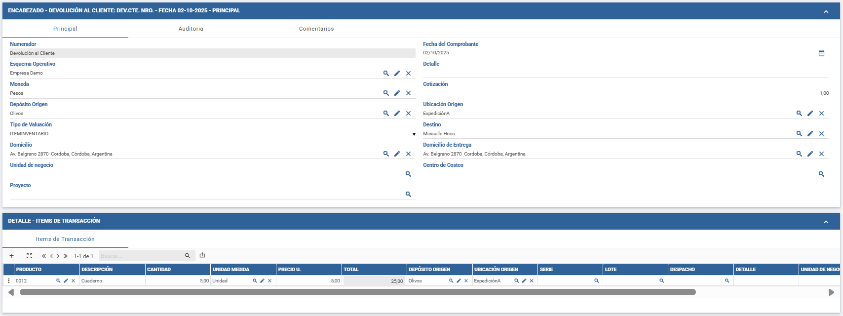 - Destino: cliente que realiza la devolución.
