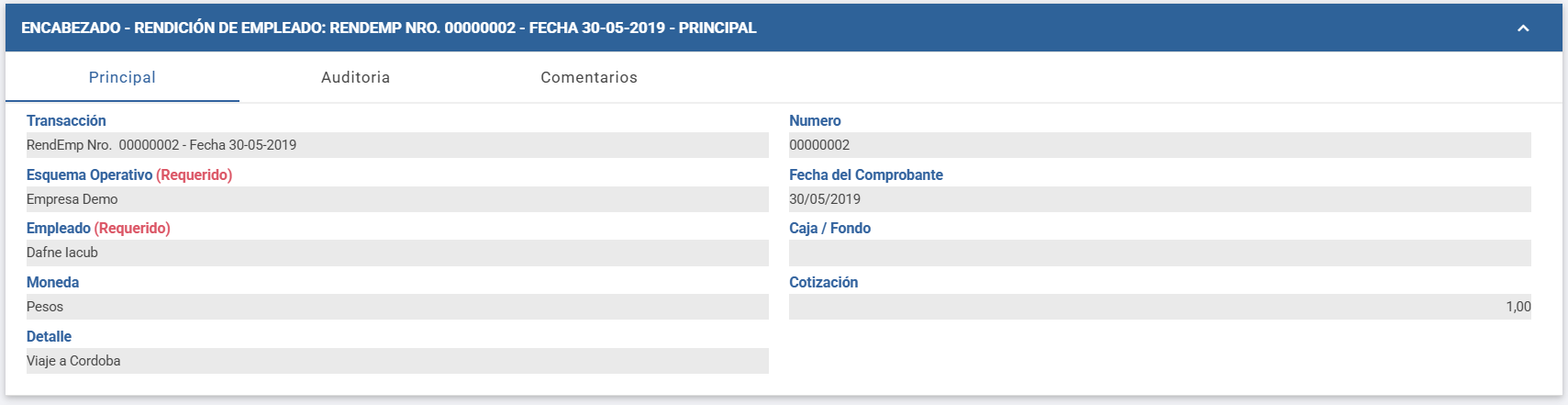 La Rendición de Empleado es la transacción que agrupa todas las rendiciones de tickets y facturas presentadas por un Empleado, registrando la deuda de la organización hacia él. La misma no genera asiento contable.