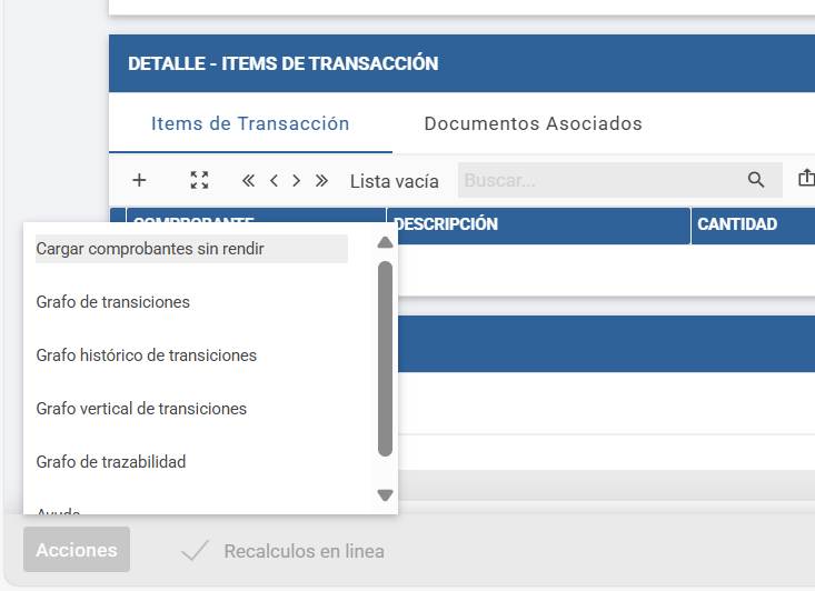 5. En la sección Detalle, la carga de ítems de esta transacción se genera de forma automática. Para eso deberá ir al botón "Acciones" y seleccionar la opción "Carga de comprobantes sin rendir".