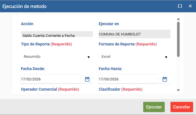 - Ejecutar: Indica el objeto sobre el cual se está posicionado al emitir el reporte. No determina necesariamente el operador comercial del informe.