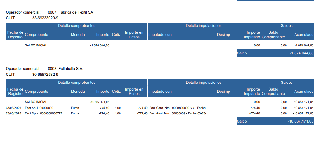 - Detallado con imputación: incluye comprobantes saldados y pendientes con sus imputaciones.