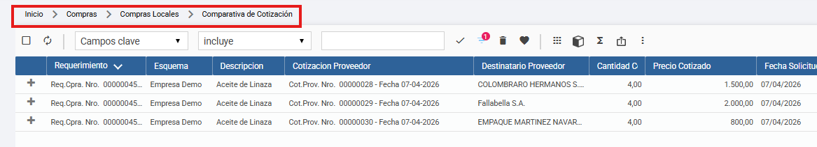 Desde la vista de Comparativa de Cotización, se podrán visualizar los datos clave de todos los proveedores que presupuestaron el ítem: